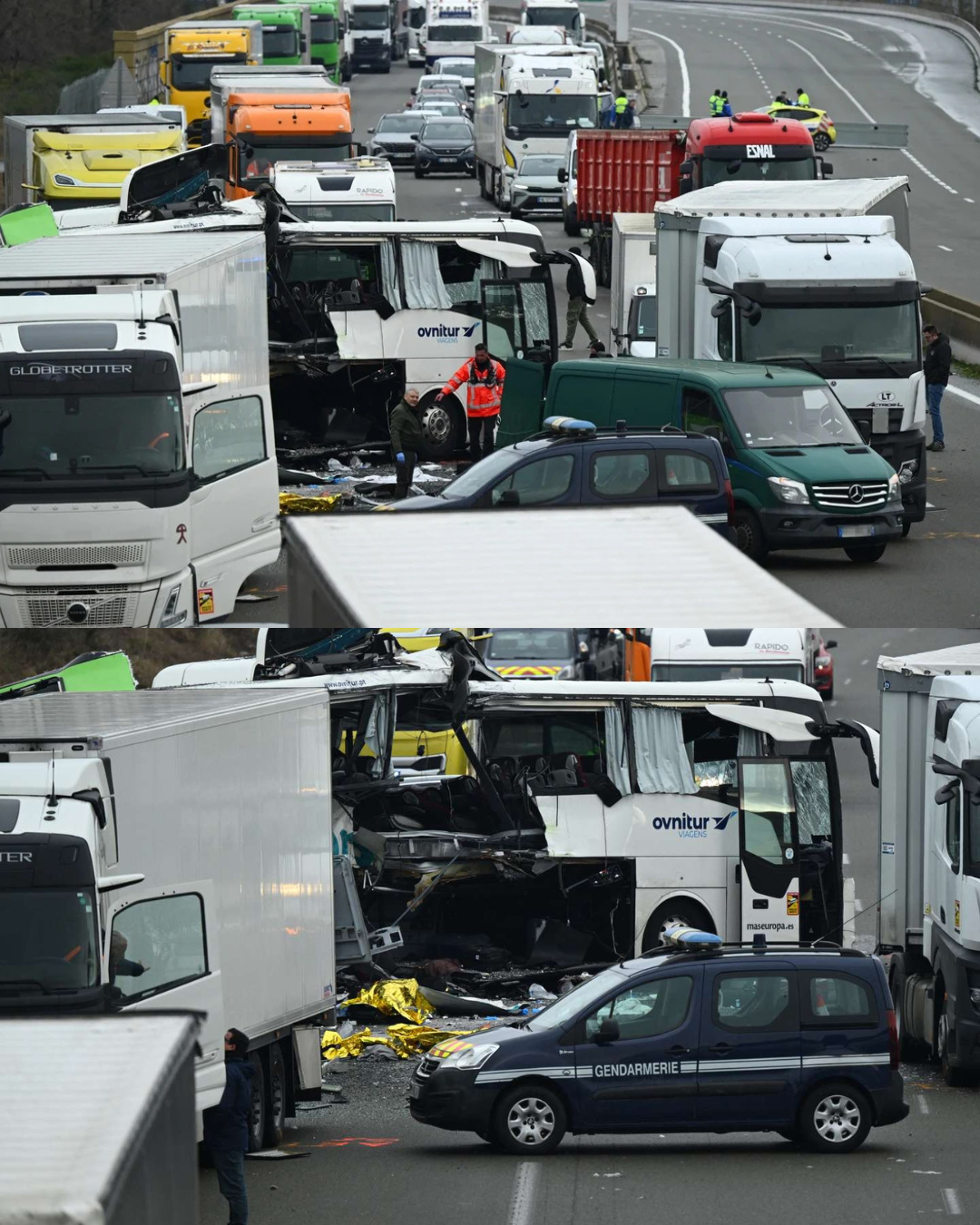 O autocarro português: Transportava passageiros e viu-se envolvido no embate inicial entre dois pesados de passageiros.